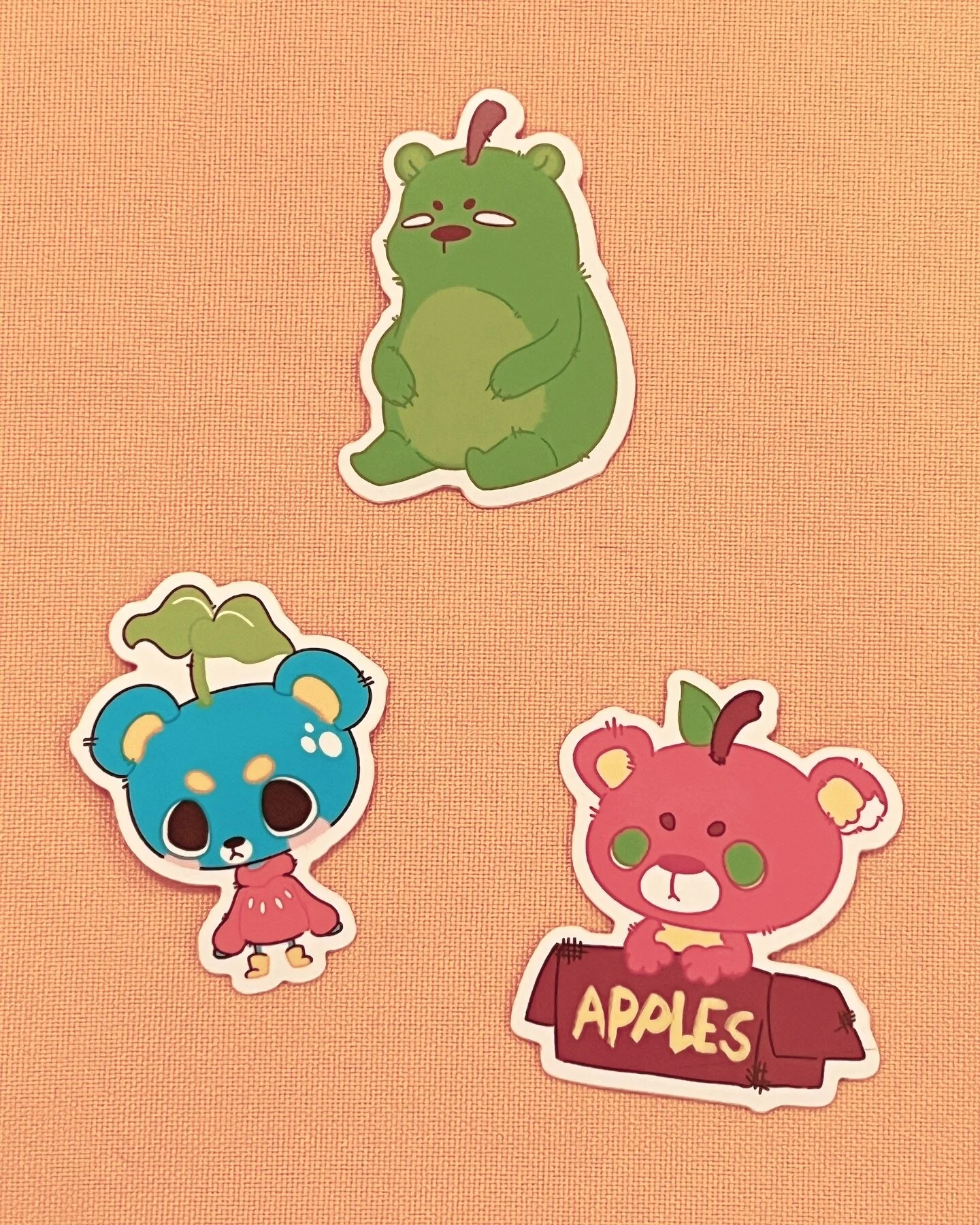 View fullsize look at these cuties! new itty bitty stickers coming with me to @designercon next weekend. Booth 331 with @mossandmoonshine and @allnighterproductions 🩵from the top we have new(old)comer, Birne 🍐followed by Bluu🌱and Pomme🍎